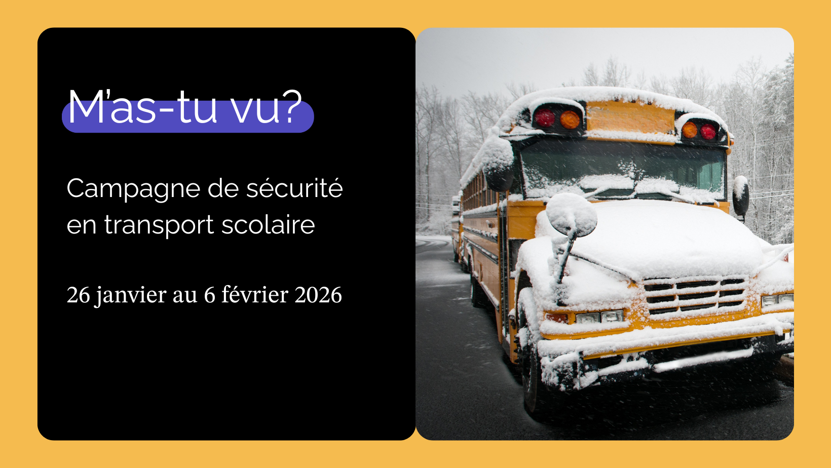Chaque année, cette campagne incontournable nous rappelle le rôle essentiel que nous avons toutes et tous à jouer pour assurer la sécurité autour des autobus scolaires. On s’entend : respecter la signalisation et redoubler de vigilance près des autobus, ce n’est pas une option – c’est nécessaire.